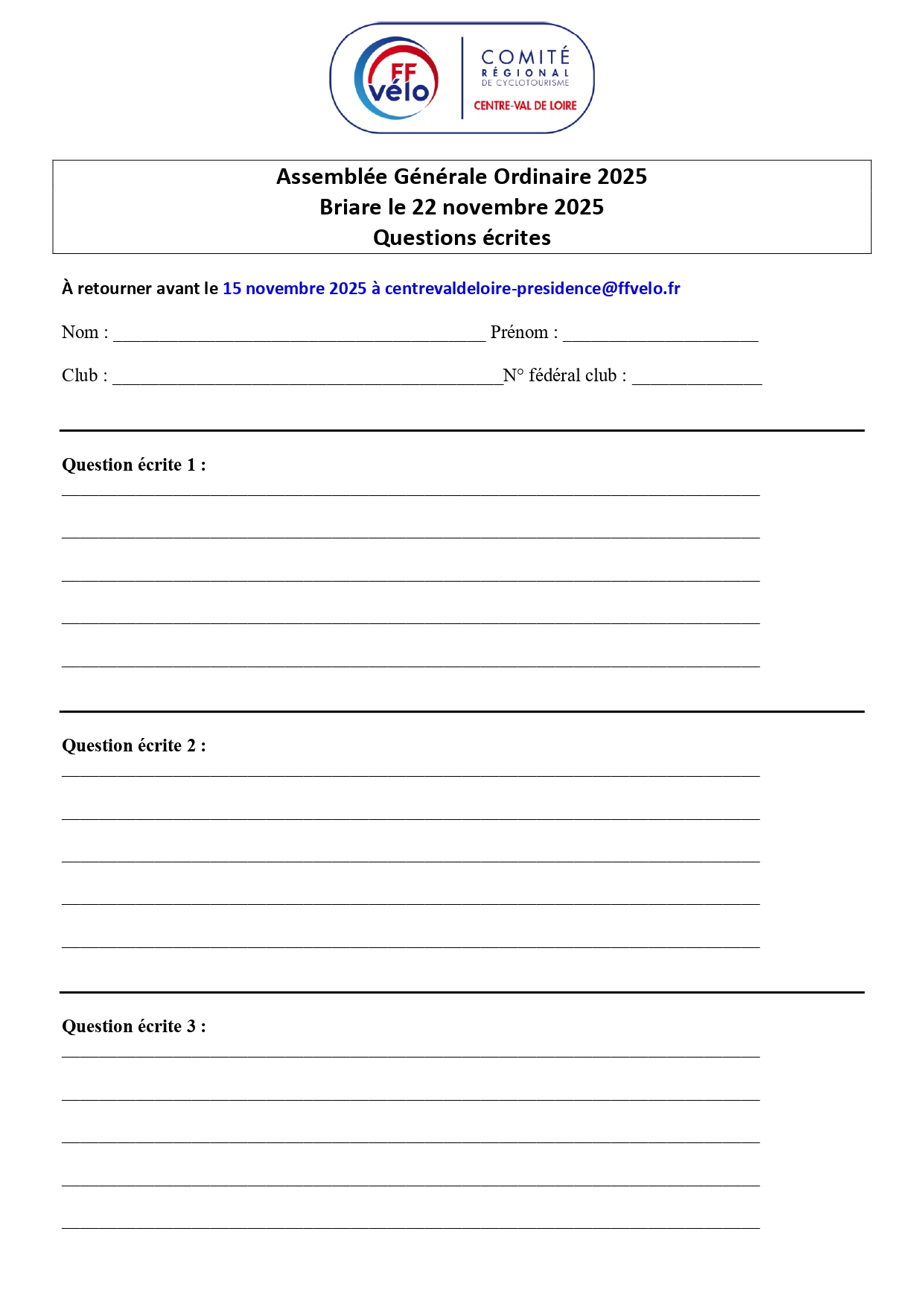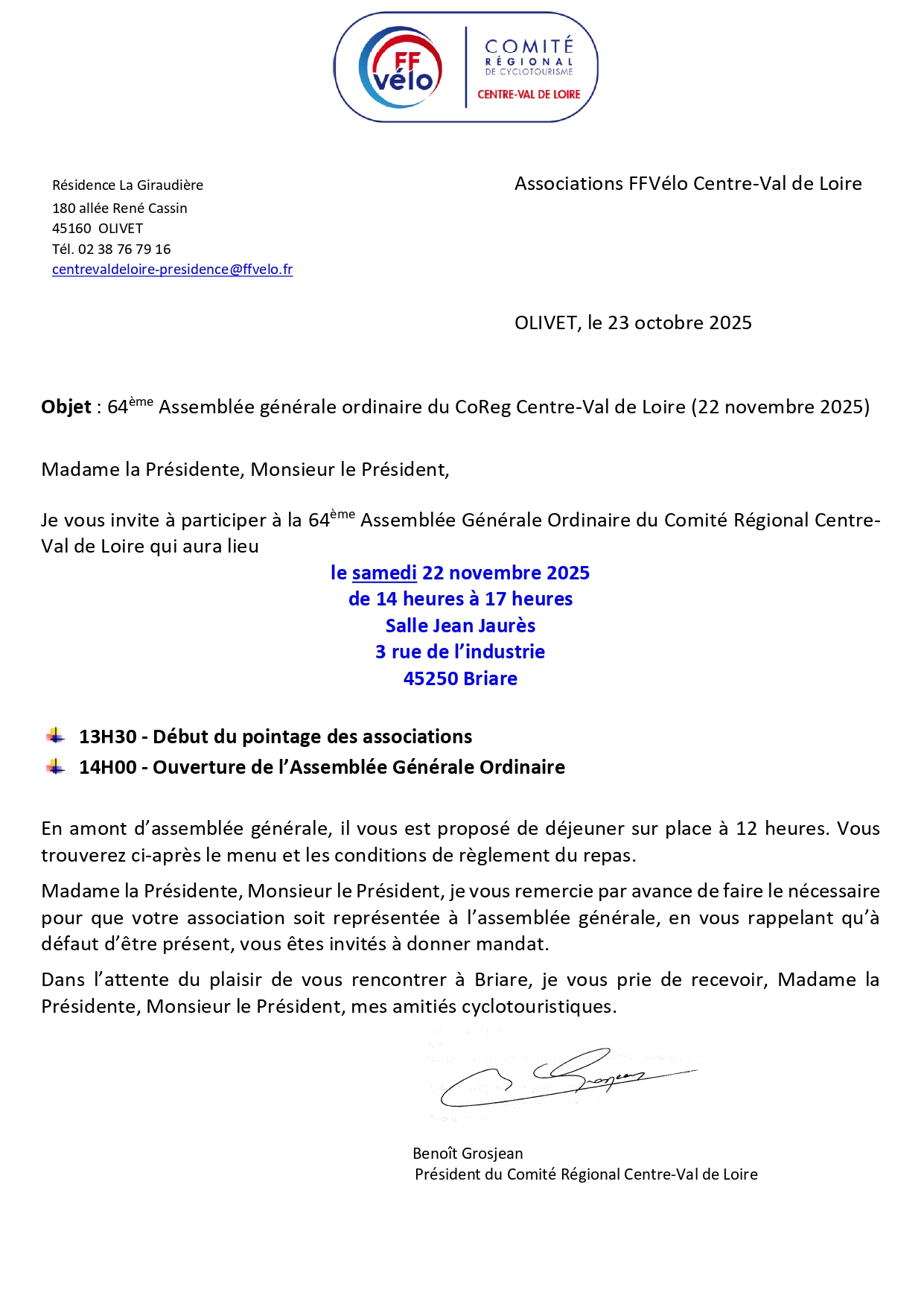 ont le plaisir d’inviter les clubs à participer à la  64ᵉ Assemblée Générale Ordinaire du Comité Régional Centre-Val de Loire,